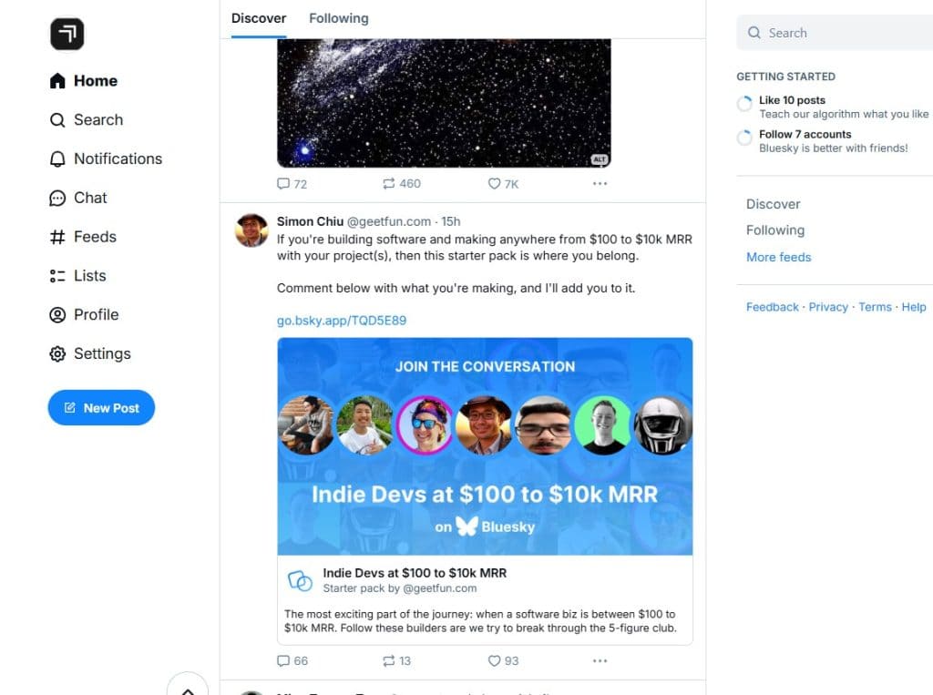 If you join through a friend’s Starter Pack, you’ll start off with their curated recommendations. Two feeds will be pinned for you automatically: Following and Discover. From there, you can tweak your setup by adding or removing recommendations to suit your vibe.
