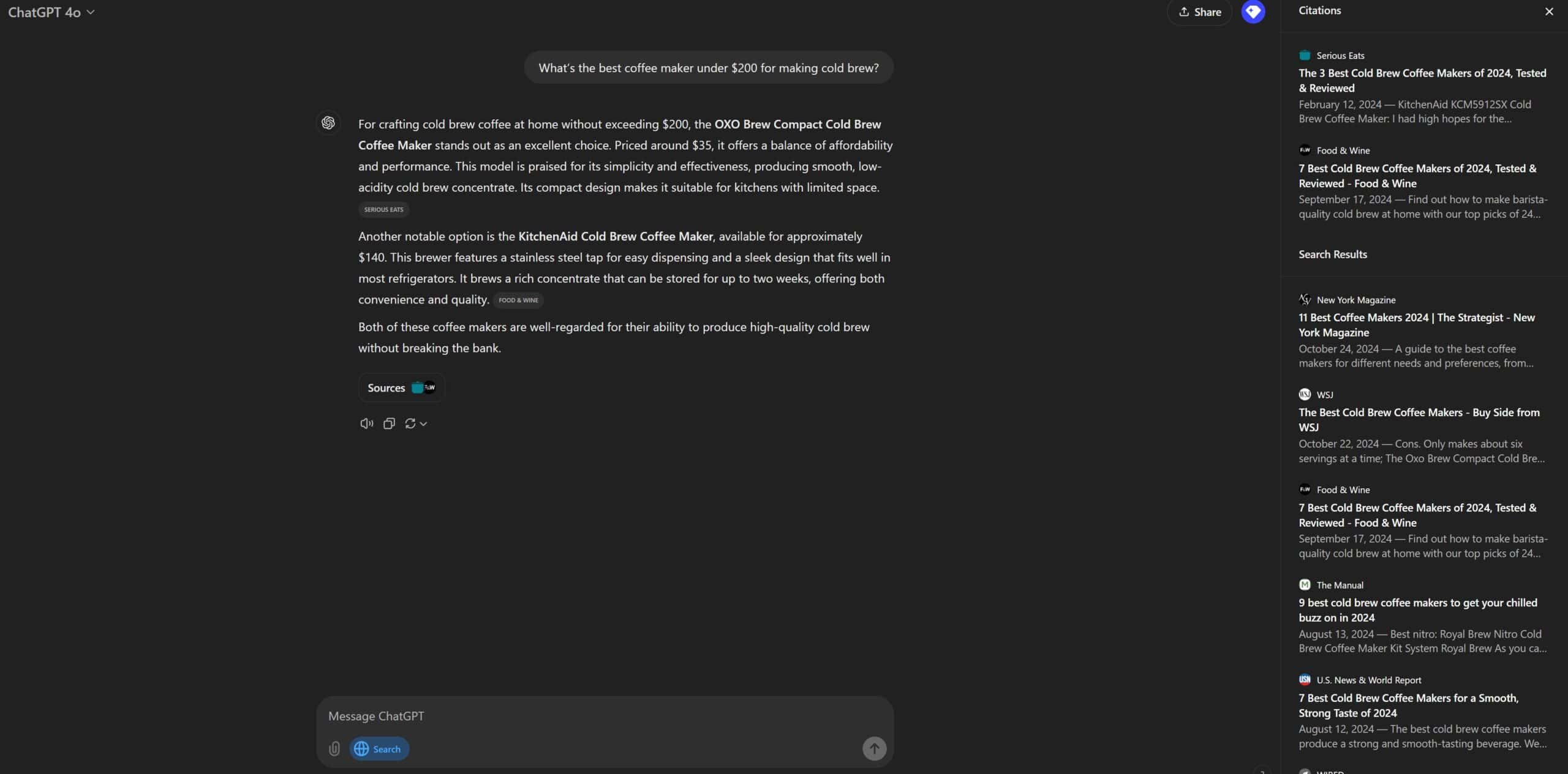 Real-World Example: Remember my coffee maker hunt? With SearchGPT, I’d simply ask, “What’s the best coffee maker under $200 for making cold brew?” Instead of opening a dozen review sites and cross-referencing affiliate-laden recommendations, SearchGPT pulls reliable information from across the web, compares features and real user experiences, and presents a clear summary. No clickbait, no keyword stuffing—just the information you need.